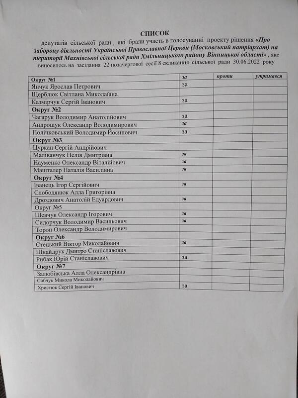 На Вінниччині перша територіальна громада заборонила на території своєї юрисдикції діяльність УПЦ (МП). Всі 15 депутатів Махнівської територіальної громади Хмільницького району Вінницької області підтримали це рішення.