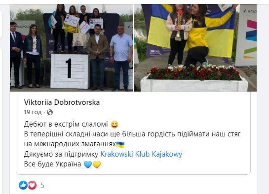 Вінницька спортсменка Вікторія Добротворська нині перебуває у Польщі, там тренується і навіть перемагає у змаганнях. Днями вона здобула перемогу у змаганнях з екстрим слалому у Польщі, в Кракові.
