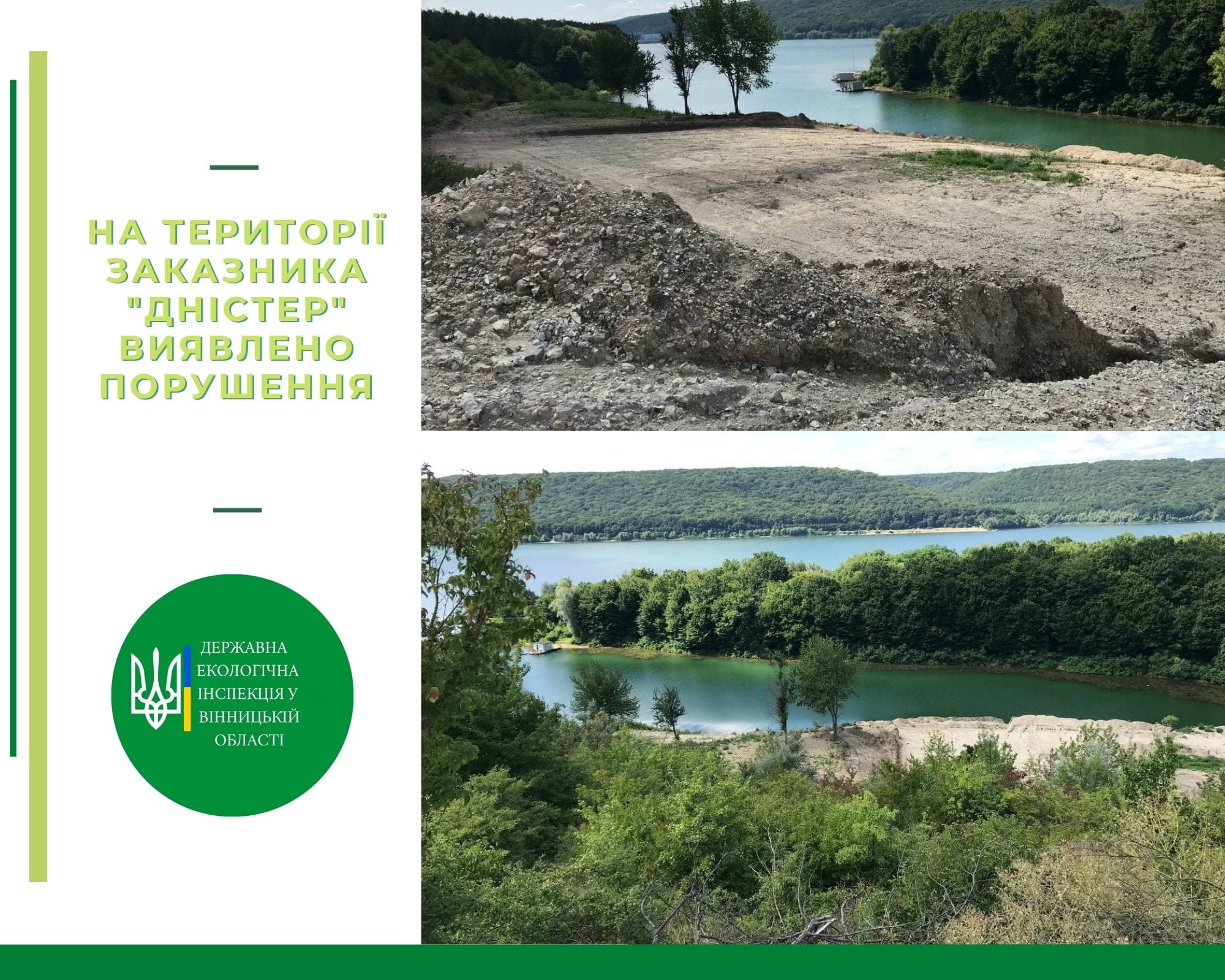 «Під час розгляду звернення громадянина щодо дотримання вимог природоохоронного законодавства на території ландшафтного заказника місцевого значення «Дністер» інспекторами Державної екологічної інспекції у Вінницькій області виявлено будівництво шляху (ґрунтової дороги) на землях комунальної форми власності в межах вищезазначеного заказника та в межах прибережної захисної смуги річки Дністер.