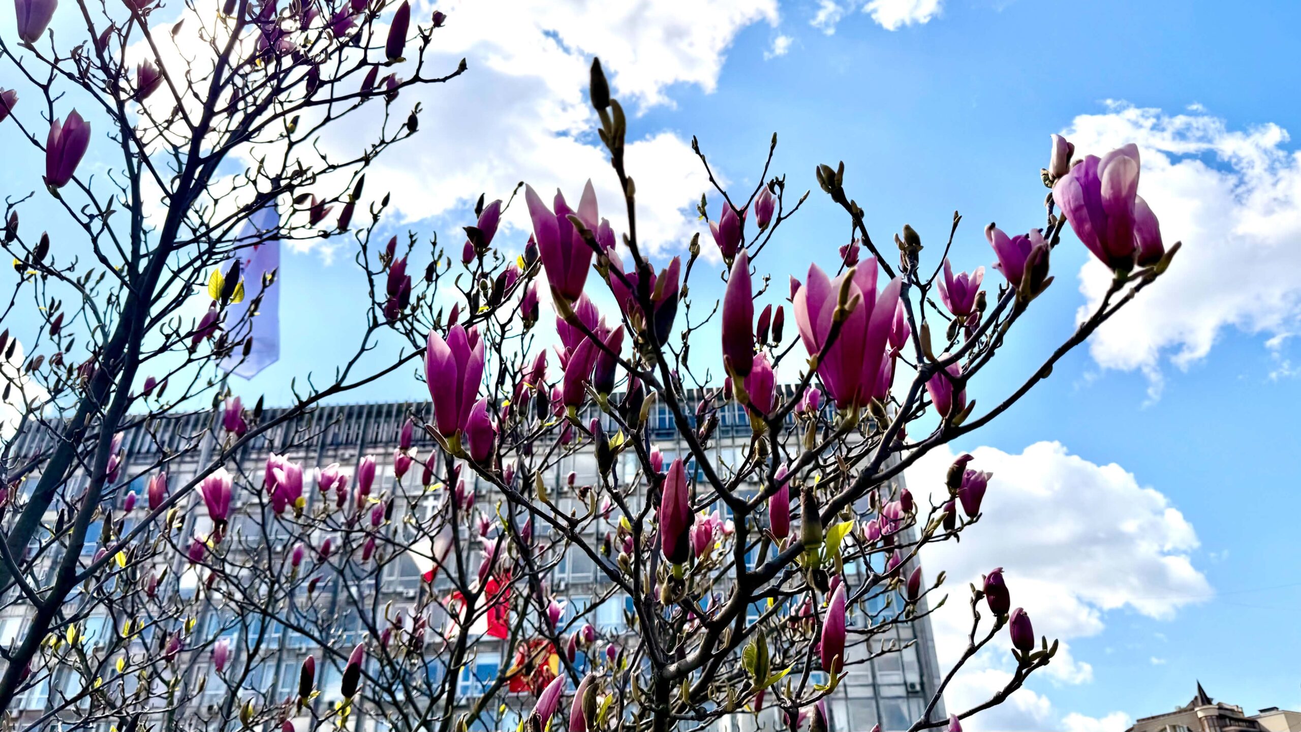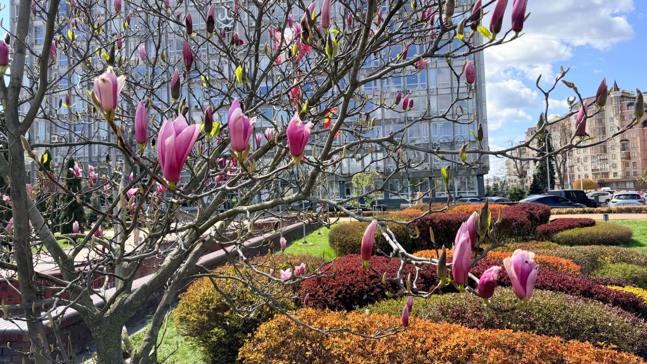 Дерева магнолій на Майдані Незалежності вкрилися ніжними рожевими квітами й одразу перетворили цю локацію на одну з найкрасивіших у місті.