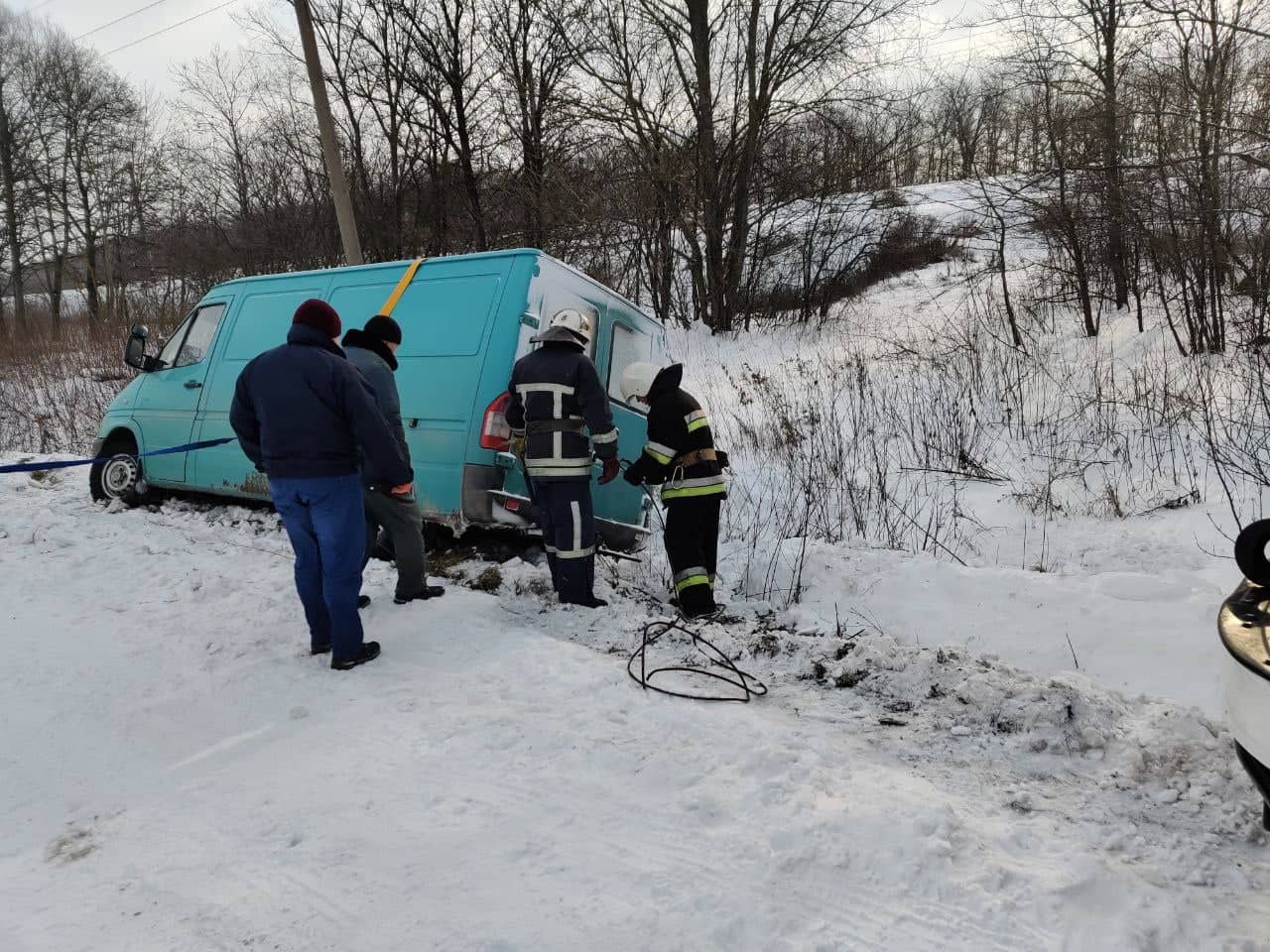 Прибувши на місце події, рятувальники ДПРЧ-8, у складі трьох чоловік особового складу, за допомогою буксирувального тросу вивільнили автомобіль зі снігової пастки.