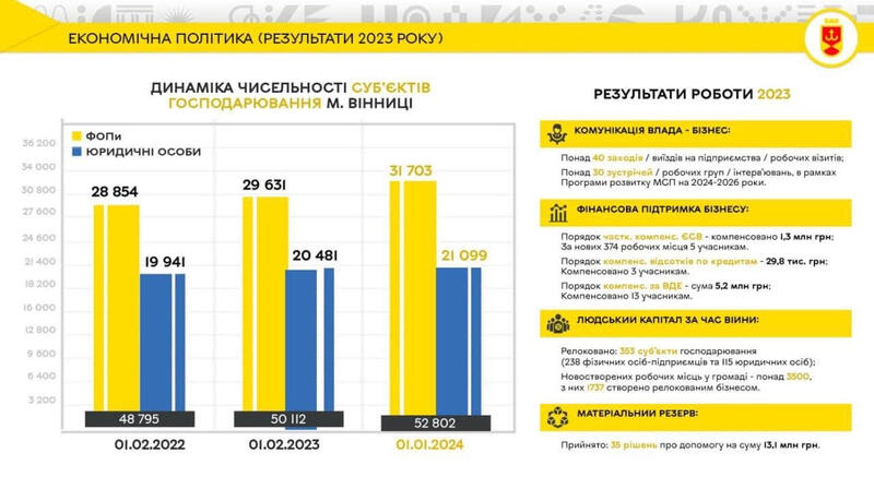 «Наразі серед зареєстрованих у ВМТГ маємо 31 703 ФОПи та 21 099 юридичних осіб. З 24 лютого 2022 року по 1 січня 2024 року до нас релокувалися 353 суб’єкти господарювання з інших регіонів України. Маємо понад 3,5 тисячі новостворених місць, з них 1737 – створені переміщеним бізнесом. Міська рада протягом року продовжувала підтримувати бізнес за трьома напрямками: часткова компенсація ЄСВ, компенсація відсотків за залученими кредитами, компенсація за встановлене обладнання для виробництва електроенергії з ВДЕ. Торік Вінниця підтвердила інвестиційний рейтинг на рівні invAA від IBI Rating, а також отримала відповідну відзнаку uaINV5 від Credit Rating», – йшлося на нараді.