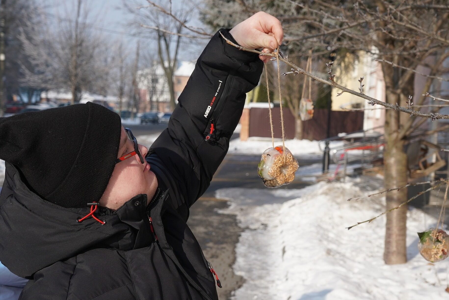 Для «льодяників» використовували крупи, ягоди, природний декор і воду або желатин — без шкоди для довкілля. Готові екогодівнички розмістили на деревах поруч із центром.