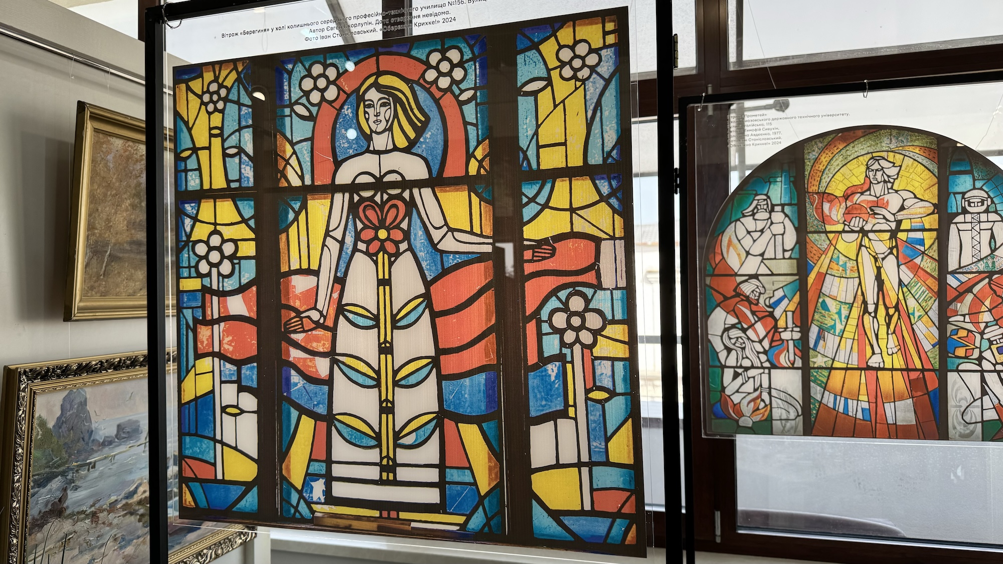 Виставка познайомить вас з шістьма знищеними вітражами Маріуполя, а також продемонструє мінікопії маріупольських панно: «Прометей» та фрагмент вітража Маріупольської камерної філармонії, що виконані у класичній вітражній техніці.