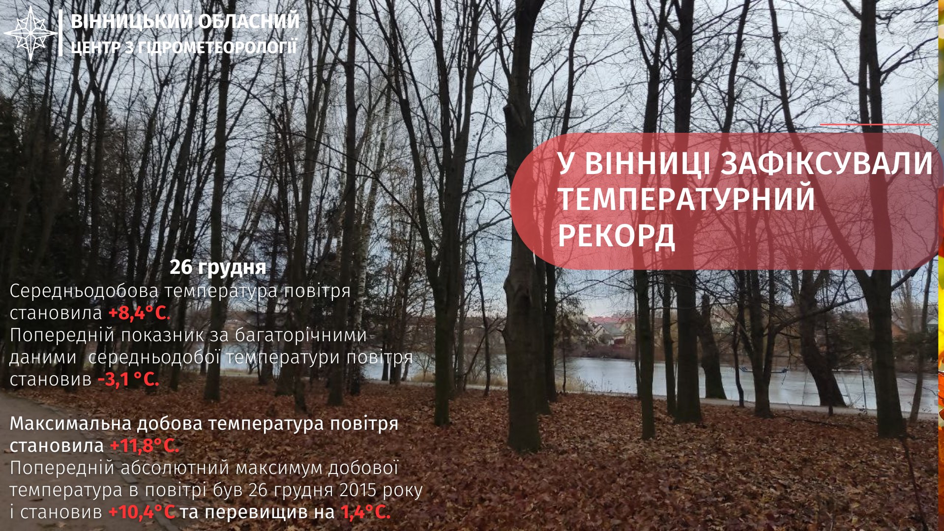 Вчора, 26 грудня, у Вінниці синоптики зафіксували новий температурний рекорд. Середньодобова температура становила +8,4 градуса тепла. Попередній максимум утримувався з 2015 року.