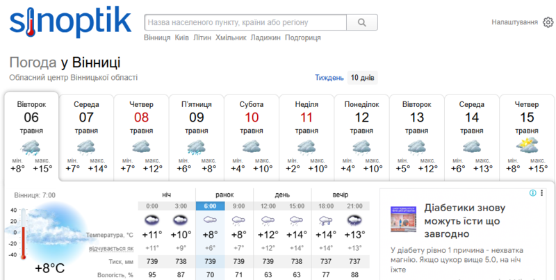 Як видно із прогнозу інших синоптиків, і у найближчий тиждень погода на Вінниччині не балуватиме мешканців теплом та сонцем.