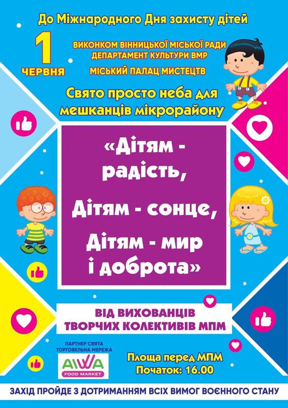 Мистецький захід з нагоди Дня захисту дітей організовують просто неба – на площі напроти МПМ “Зоря”, початок о 16:00. Концерт влаштовує Міський Палац мистецтв “Зоря” за підтримки виконкому та департаменту культури Вінницької міської ради.