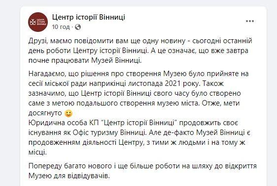 «Юридична особа КП “Центр історії Вінниці” продовжить своє існування як Офіс туризму Вінниці. Але де-факто Музей Вінниці є продовженням діяльності Центру, з тими ж людьми і на тому ж місці».