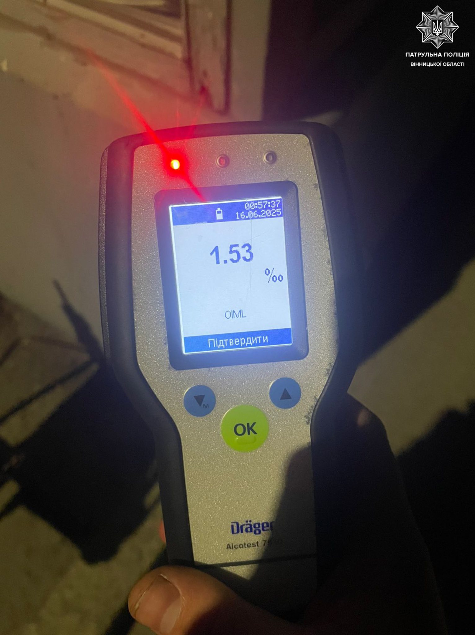 Спілкуючись із водієм, інспектори виявили у нього ознаки алкогольного сп’яніння. Чоловік погодився пройти огляд на спецприладі Драгер. В організмі порушника виявили 1, 53 проміле алкоголю, що майже у 8 разів перевищує допустиму норму.