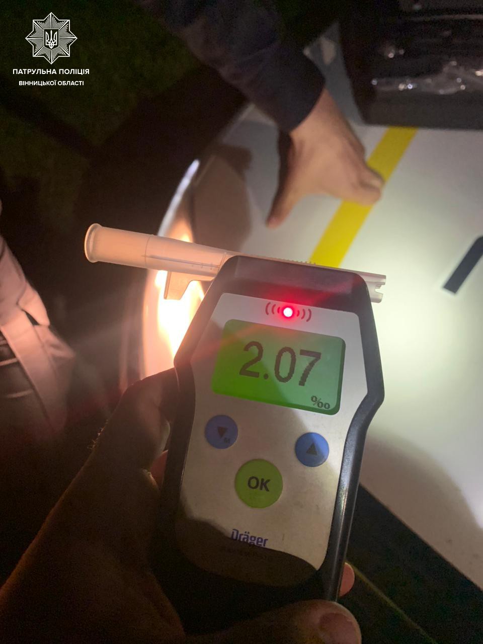 У вечері за порушення ПДР на вулиці Волошковій патрульні зупинили автомобіль ВАЗ 21900. У водія помітили ознаки алкогольного сп’яніння. Патрульні запропонували кермувальнику пройти перевірку на алкотестері. Спецприлад Drager показав 2,07 проміле алкоголю.