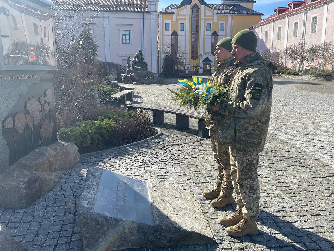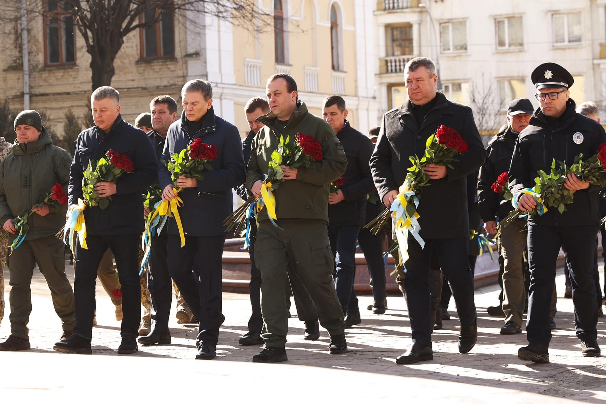 Сьогодні представники обласної та міської влади разом з військовими, керівниками служб і департаментів області, громадськістю міста вшанували хвилиною мовчання героїв, поклавши квіти до скульптурної композиції  «Дерево свободи».
