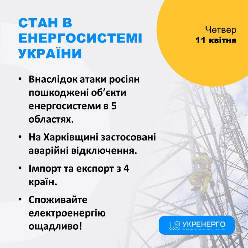 На ранок знеструмлено було 380 населених пунктів. Через бойові дії були знеструмлення у Вінницькій, Донецькій, Івано-Франківській, Сумській, Харківській областях.