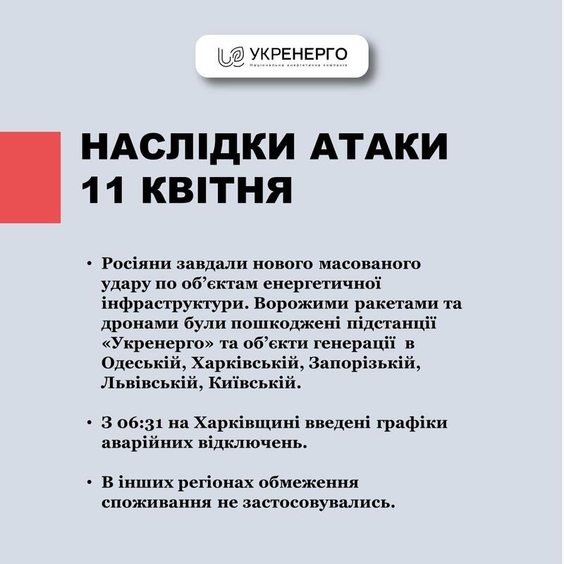 Сьогодні вранці внаслідок масованої комбінованої атаки, російськими ракетами та дронами були пошкоджені підстанції «Укренерго» та об’єкти генерації в Одеській, Харківській, Запорізькій, Львівській та Київській областях.