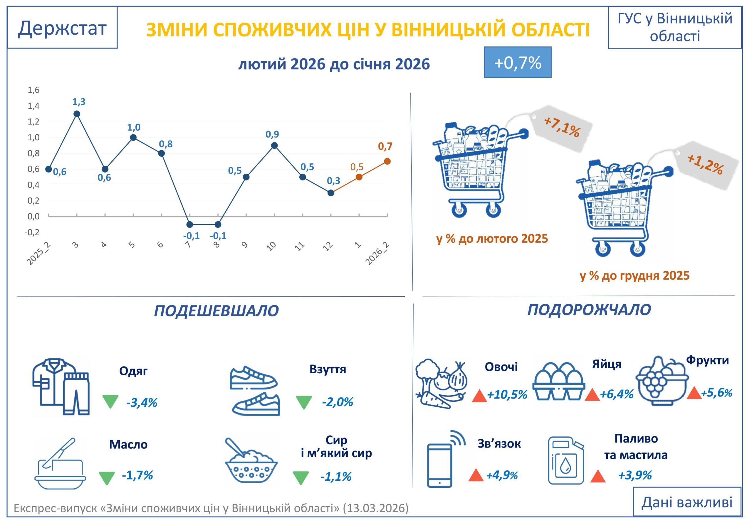 За розрахунками і повідомленням Держстату величина індексу споживчих цін (інфляція) у лютому 2026 року порівняно із січнем становила в Україні 101,0%, у Вінницькій області – 100,7%.