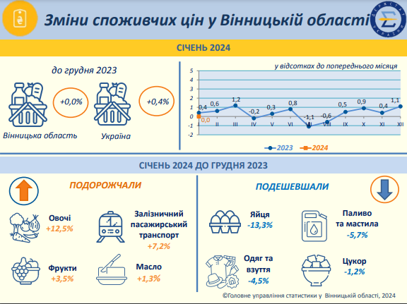 За розрахунками та повідомленням Держстату величина індексу споживчих цін (індексу інфляції) в січні 2024 року порівняно із груднем 2023 року в Україні становила 100,4%, у Вінницькій області – 100,0%. Хоча зростання рівня інфляції статистики не помітили, але ціни на деякі товари та послуги зростали, а на деякі – зменшувалися.