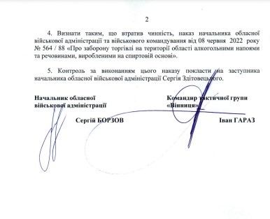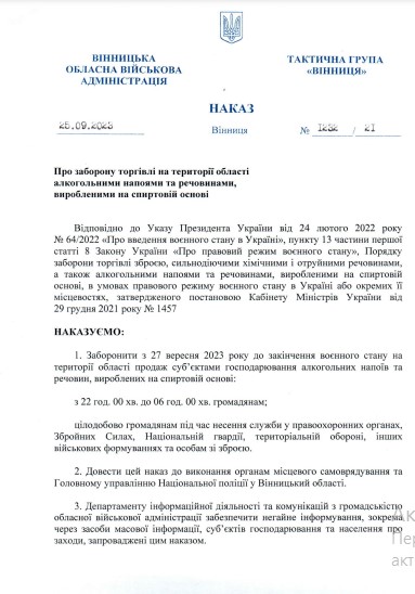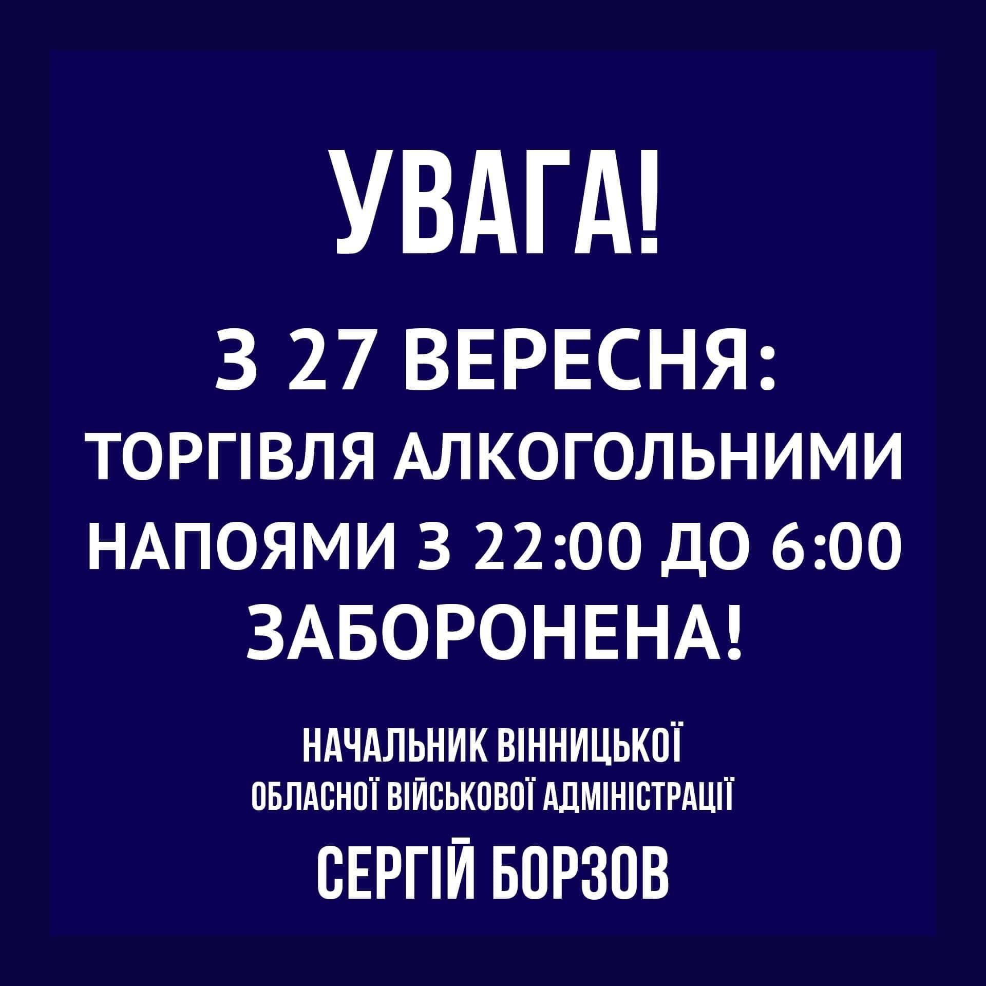Начальник Вінницької ОВА Сергій Борзов підписав наказ про заборону продажу алкоголю з 22:00 до 06:00 на території Вінницької області. Наказ набирає чинності з 27 вересня 2023 року і діятиме до закінчення воєнного стану.