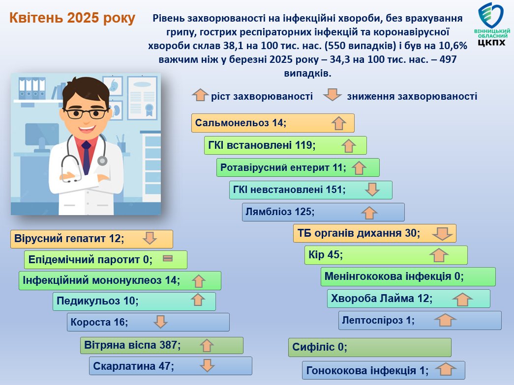 У квітні 2025 зменшилася кількість випадків гострих кишкових інфекцій невстановленої етіології, проте зареєстровано більше випадків ротавірусного ентериту та сальмонельозу. Порівняно з березнем 2025 року зменшилася кількість випадків корости, проте зросла захворюваність на педикульоз.