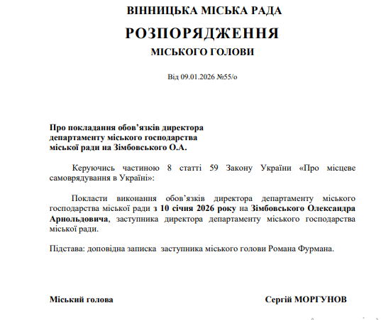 Тимчасовим виконавцем обов’язків керівника він призначив іншим розпорядженням з 10 січня 2026 року. Їх покладено на Олександра Зімбовського, заступника директора департаменту міського господарства міської ради.