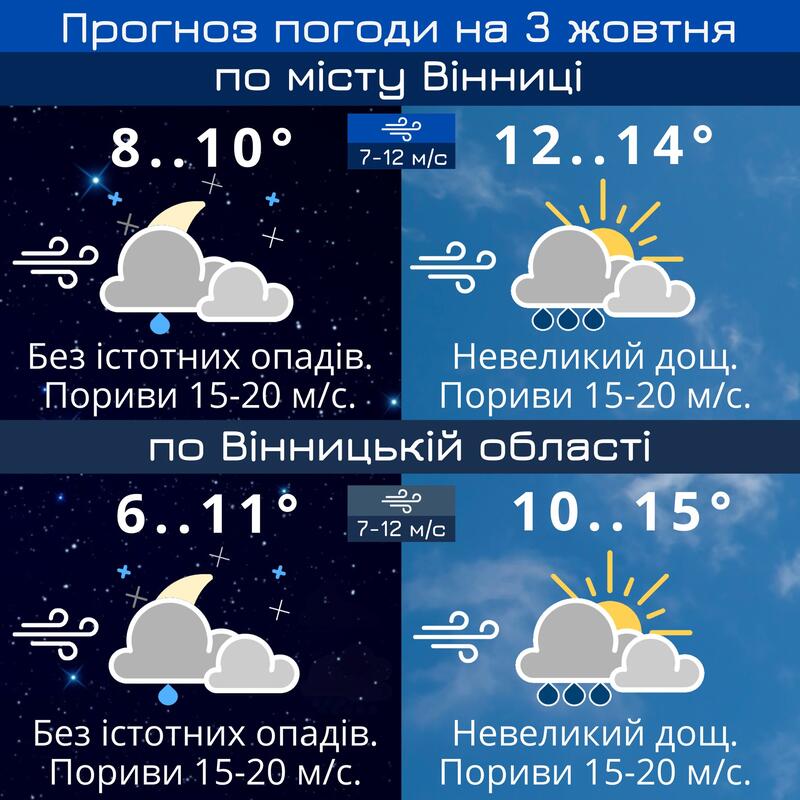 Прогноз погоди по місту Вінниці на 3 жовтня.