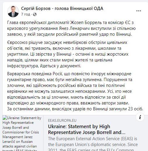 «Євросоюз рішуче засуджує невибіркові обстріли цивільних об’єктів, які тривають, включно з лікарнями, школами та укриттями. Ці звірства у Вінниці – останні в низці жорстоких нападів, цілями яких стали мирні жителі та цивільна інфраструктура, йдеться у документі», – про це у дописі повідомив начальник ОВА Сергій Борзов.
