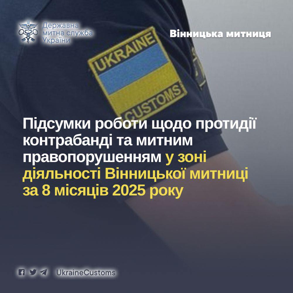 Підсумки роботи щодо протидії контрабанді та митним правопорушенням у зоні діяльності Вінницької митниці за 8 місяців 2025 року. За підсумками січня – серпня 2025 року в зоні діяльності Вінницької митниці складено 305 протоколів про порушення митних правил. Вилучено предмети у порушених митних правилах у 87 справах, вартістю понад 1 млн грн.