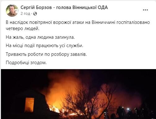 Про наслідки атаки ворожого «Шахеда» повідомив додатково начальник Вінницької ОВА Сергій Борзов. Він пообіцяв оприлюднити подробиці згодом.