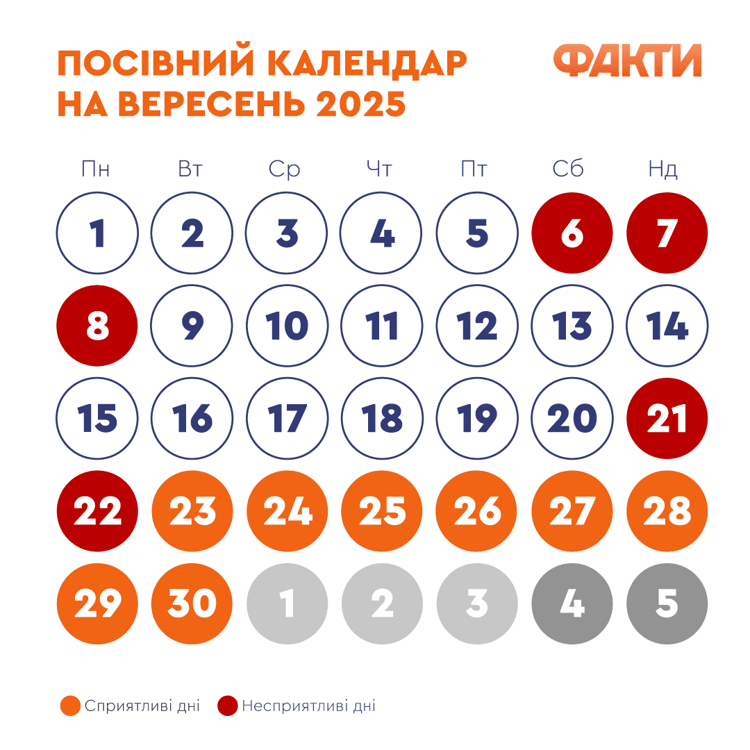 Несприятливі для садіння рослин дні: 1, 4, 5, 6, 7, 13, 14, 17, 18, 19, 21, 27, 28 вересня