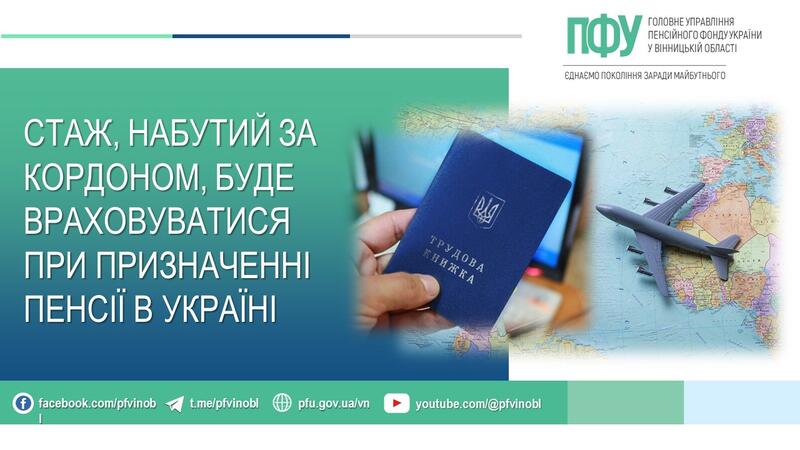Довідково, законодавчі акти: Закон України від 25.04.2024 року №3674-IX «Про внесення змін до деяких законів України щодо врегулювання питання обчислення страхового стажу та пенсійного забезпечення», постанова Кабінету Міністрів України від 16.05.2025 року №562 «Деякі питання обчислення страхового стажу», стаж, який наші громадяни набувають в інших країнах, буде включено для визначення права на пенсію за віком в Україні.