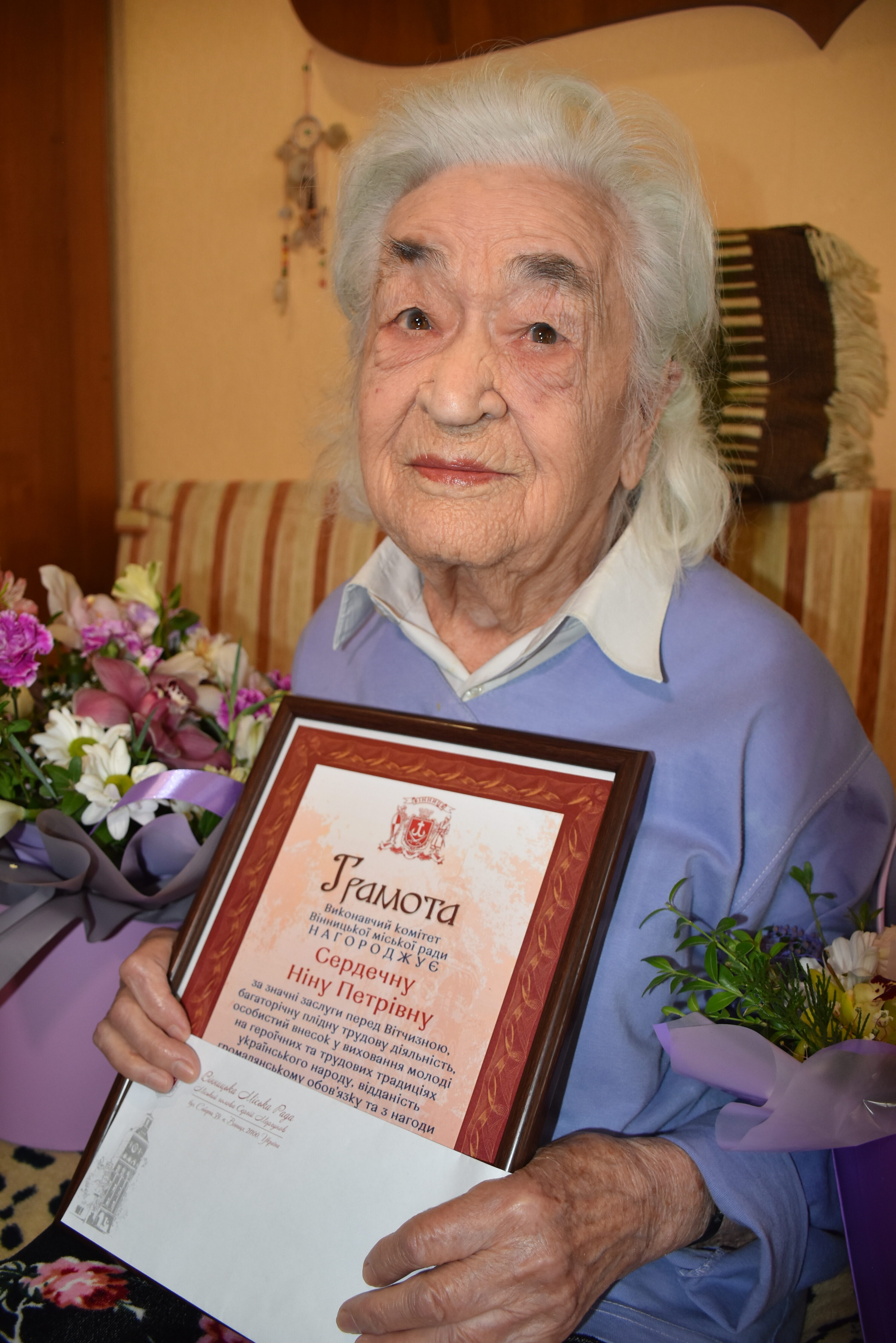 Ювілярка отримала грамоту міської ради. Ніну Сердечну відзначили за значні заслуги перед Батьківщиною, багаторічну плідну трудову діяльність, особистий внесок у виховання молоді на героїчних та трудових традиціях українського народу, відданість громадянському обов’язку. Крім того, їй вручили грошову допомогу.