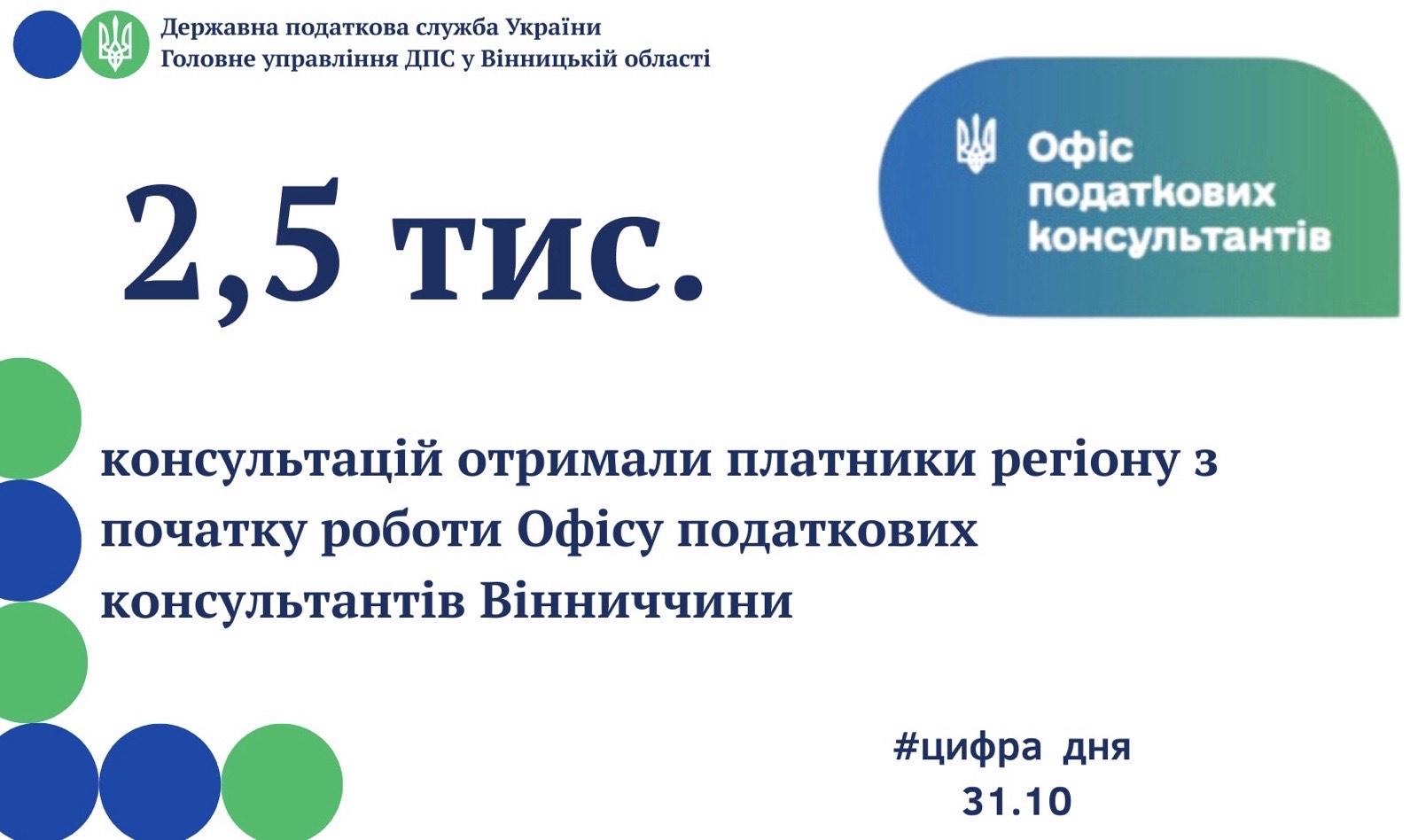 З початку роботи Офісу податкових консультантів Вінниччини платники регіону отримали майже 2,5 тисячі консультацій. У ТОП-3 тем, з якими звертались платники Вінниччини, оподаткування фізичних осіб (907), податкові борги (617) та оподаткування юридичних осіб (169).