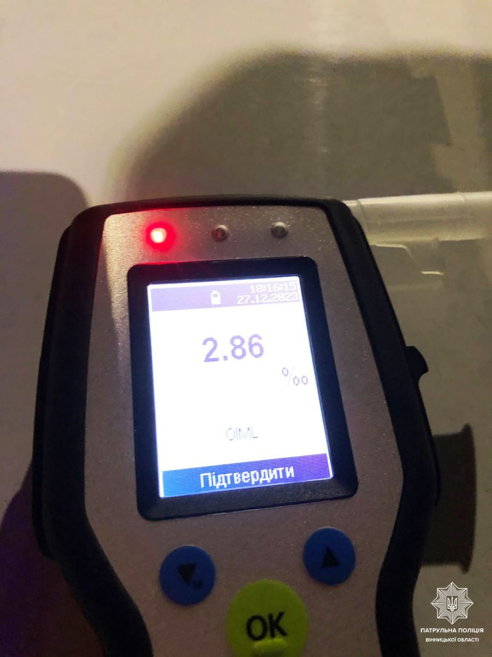 «Чоловік пройшов огляд на стан сп’яніння на місці зупинки. Спецприлад Драгер виявив 2,86 проміле алкоголю в організмі кермувальника, що в 14 разів перевищує допустиму норму», – йдеться у повідомленні.