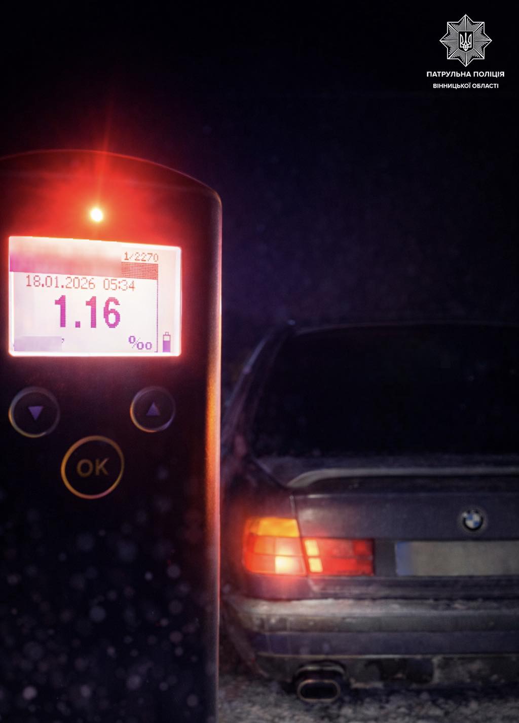 Чоловіку запропонували пройти перевірку на спецприладі Драгер. Результат огляду — 1,16 проміле алкоголю.