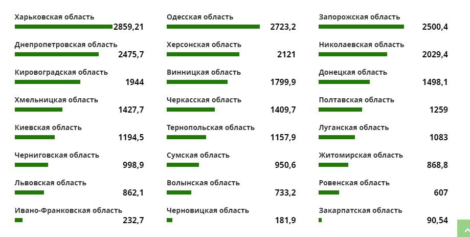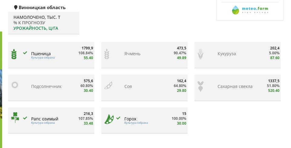 За цими даними Вінниччина займає лиш 11 місце у рейтингу областей. Данні на сайті показують, що валовий збір зерна, усіх продовольчих та технічних культур становив на 13 жовтня 1799,9 тисячі тонн.