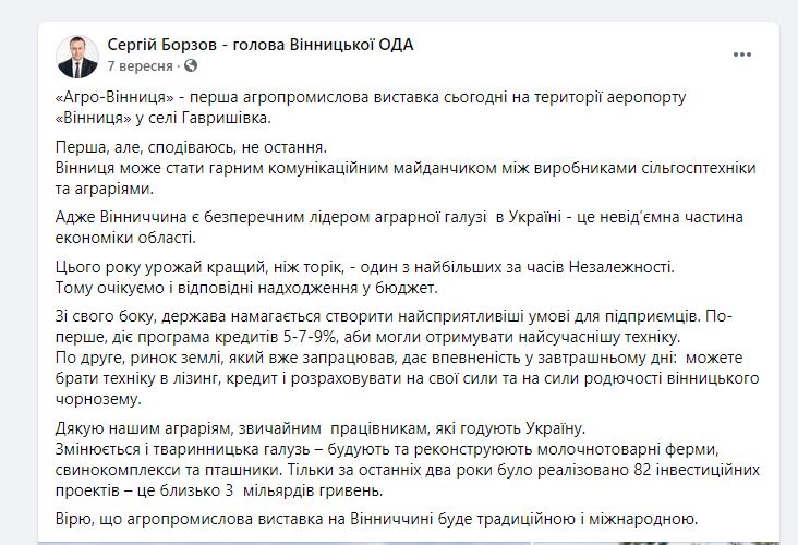 Також оцінки голови Вінницької ОДА Сергія Борзова значно відрізняються від оцінок аналітичного ресурсу. Зокрема, перед відкриттям виставки «Агро-Вінниця» він оприлюднив у Фейсбуці пост, в якому йдеться: