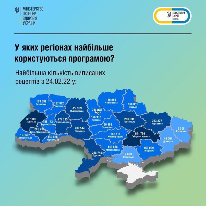 Найбільша кількість виписаних і погашених рецептів з 24.02.22 у таких областях України: