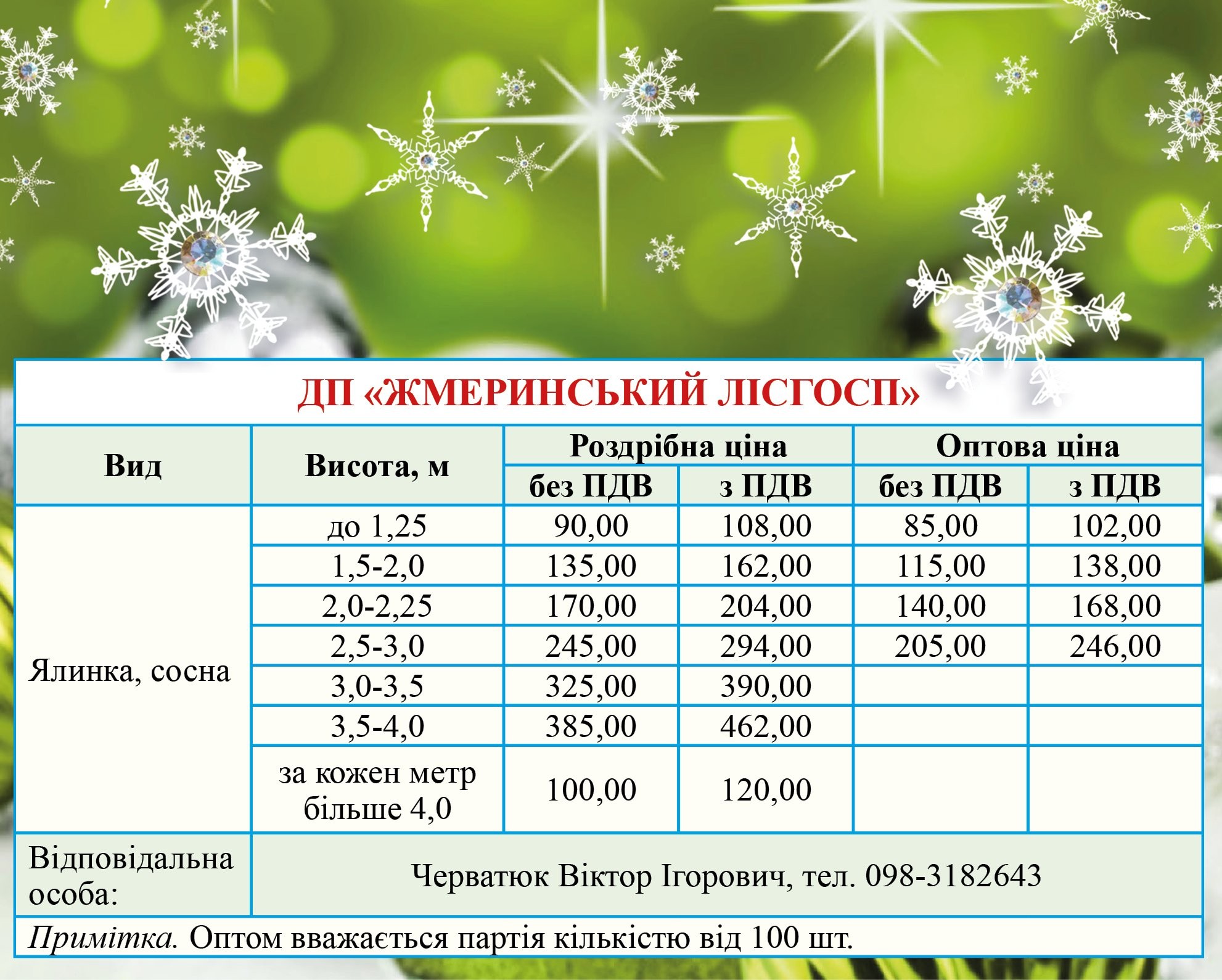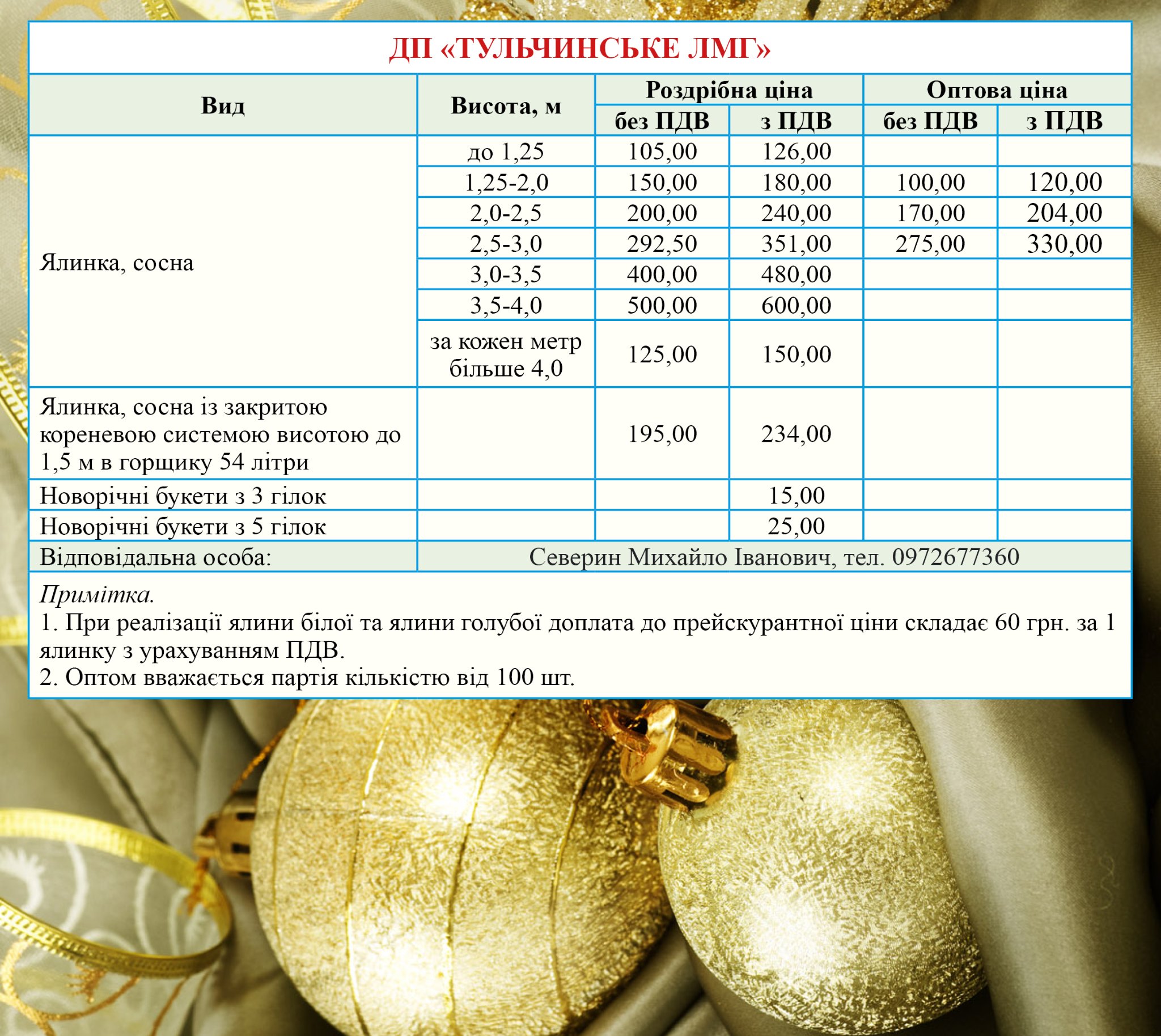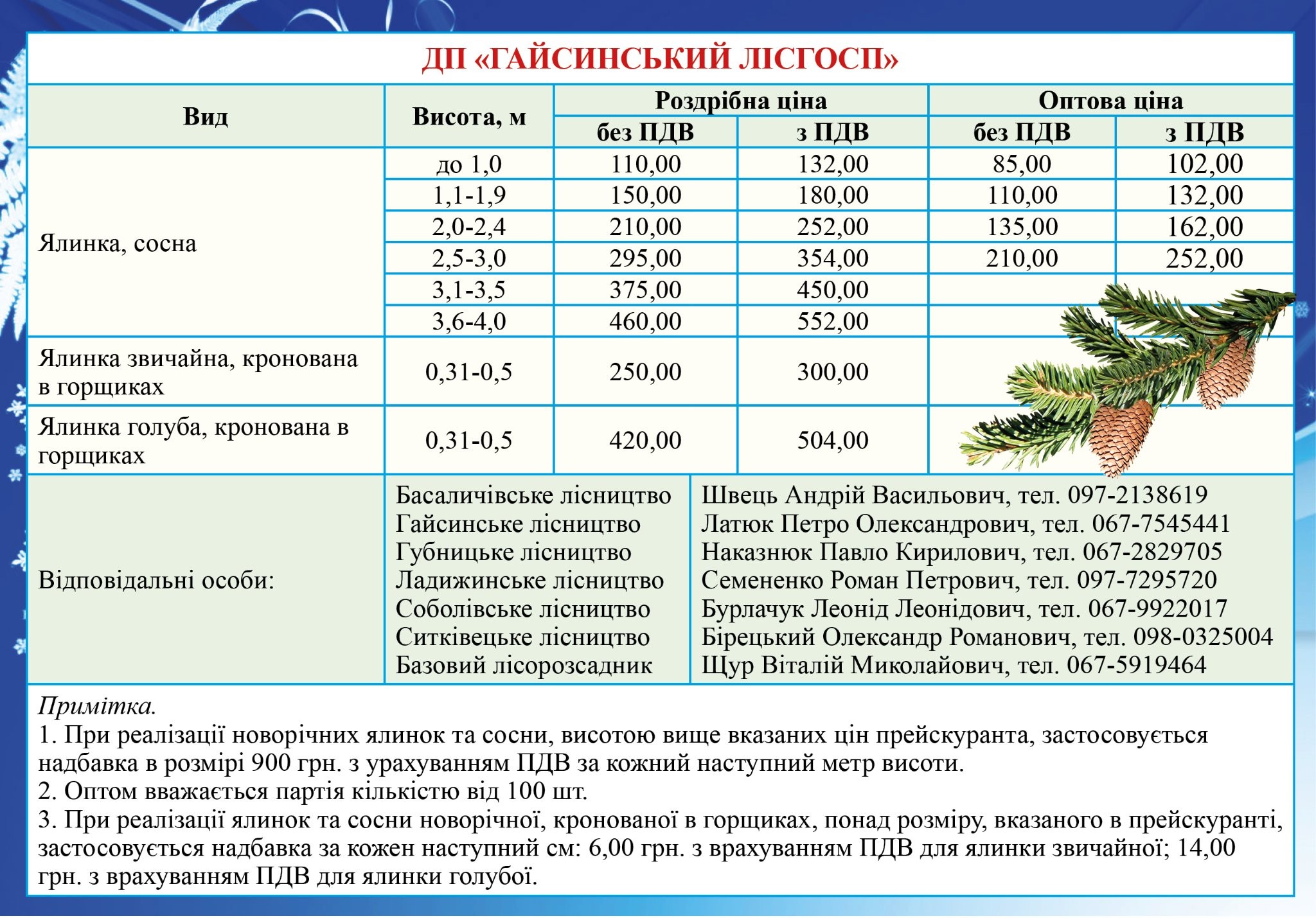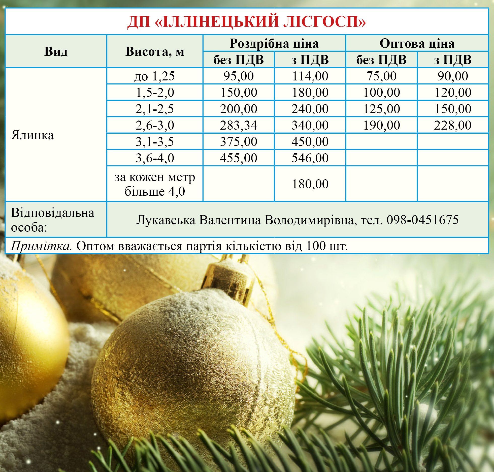Лісівники також оприлюднили контакти та прайси на новорічні дерева. Їх можна придбати у найближчому лісгоспі. А також, на ялинкових базарах, які вже діють у Вінниці.