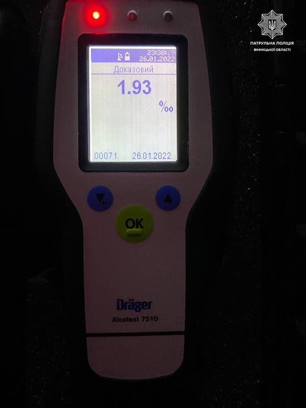 «Водієві запропонували пройти перевірку на спецприладі Drager. Алкотестер виявив в організмі чоловіка 1,93 проміле алкоголю».