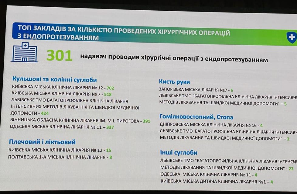 Кількість ендопротезувань постійно збільшується. Безкоштовними протезами забезпечує держава. У 2022 та 2023 році до травматологічного відділення обласної клінічної лікарні ім. Пирогова надійшло 2177 ендопротезів.
