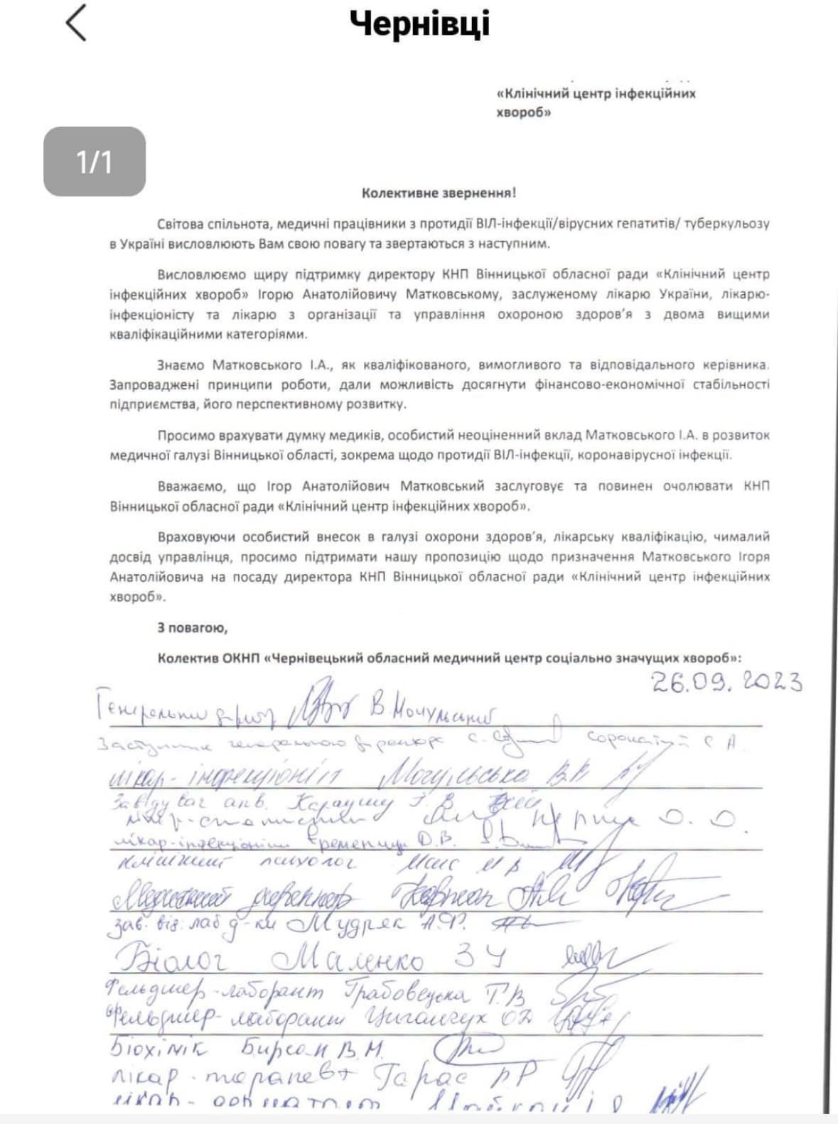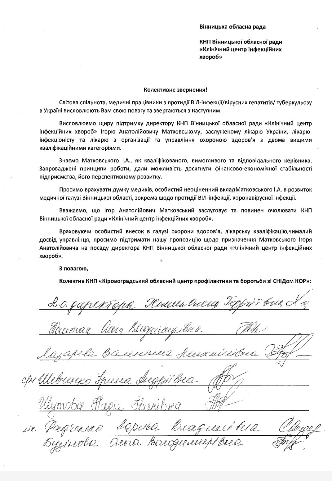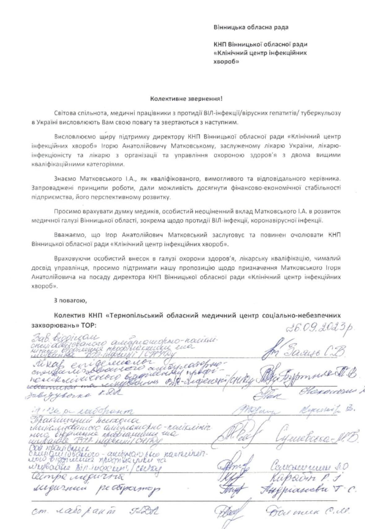 Медики з кількох українських однопрофільних центрів теж підтримують своїх колег та Ігоря Матковського. Вони надіслали відповідні заяви у Вінницьку обласну раду.