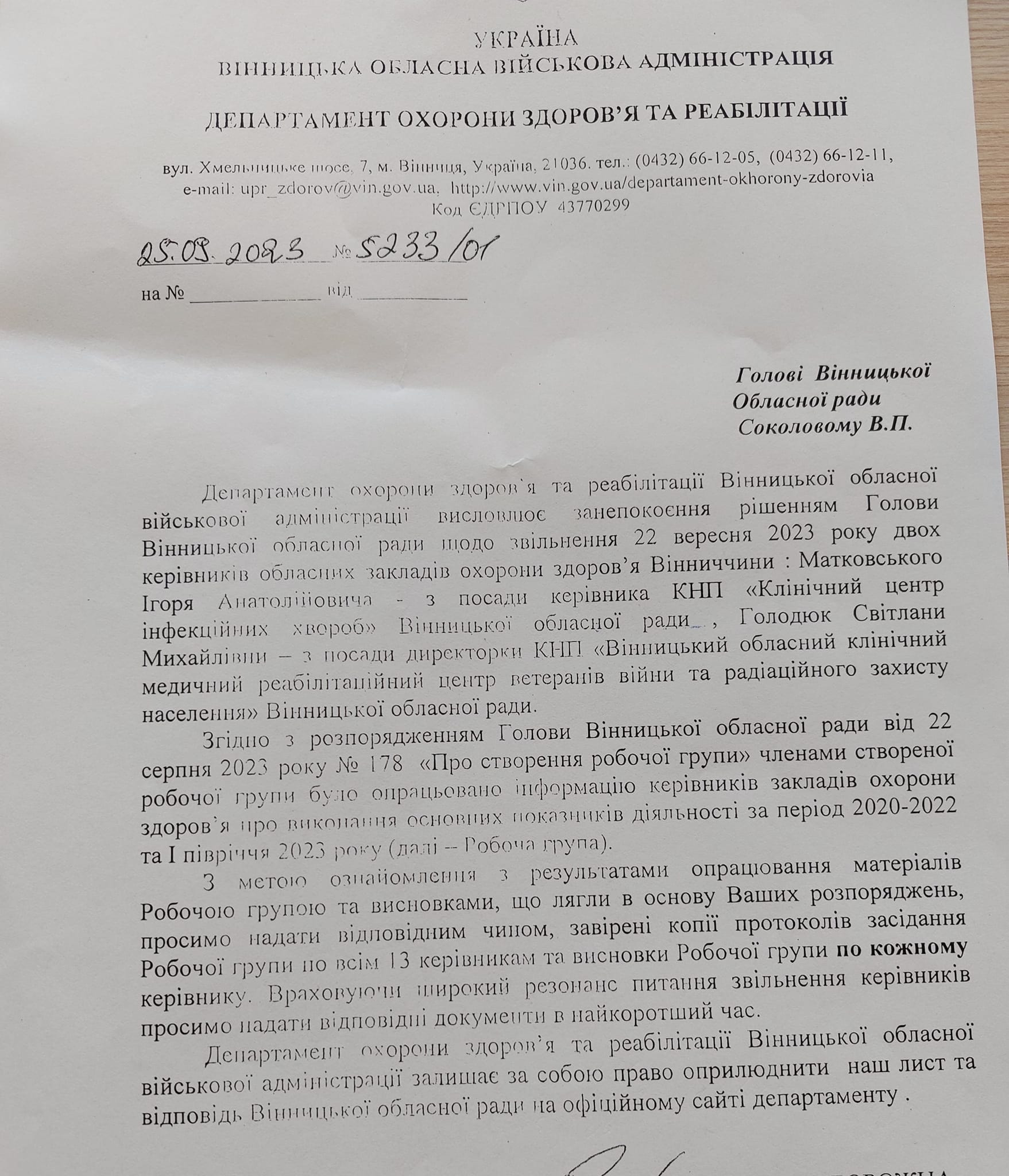 Ми повідомляли про те, що наприкінці минулого тижня рішенням голови Вінницької обласної ради Вячеслава Соколового були звільнені два керівники обласних медичних установ, директор Центру інфекційних хвороб Ігор Матковський та директорка Центру реабілітації Світлана Голодюк.