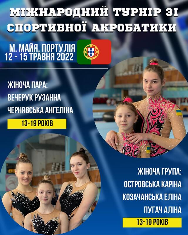 У складі збірної команди Україна зі спортивної акробатики, спортсмени Вінницької школи будуть брати активну участь змаганнях, що будуть проходити з 12 по 15 травня 2022 року у м. Майя (Португалія),