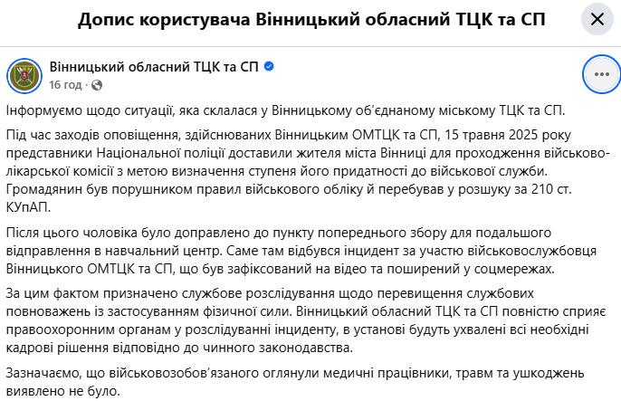 Вінницький обласний ТЦК та СП повідомив, що повністю сприяє роботі правоохоронних органів. Також у відомстві пообіцяли вжити всіх необхідних кадрових рішень відповідно до чинного законодавства.