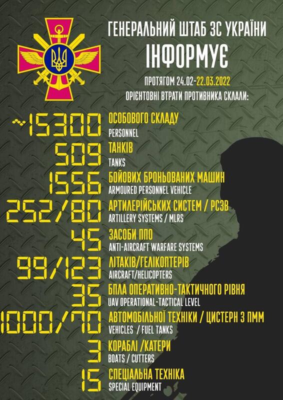 Загальні бойові втрати противника з 24.02 по 22.03 орієнтовно склали:
