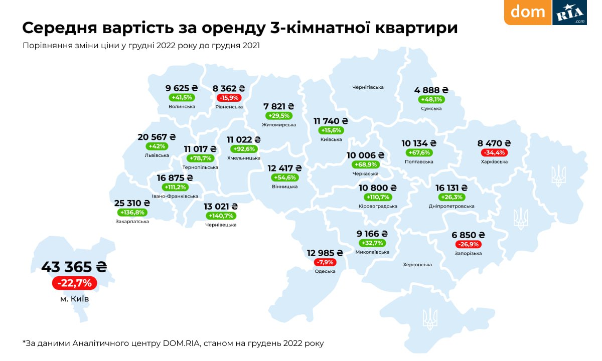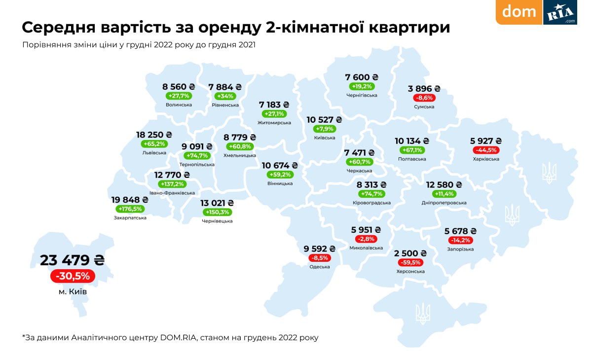 Найбільше зростання відбулося у Закарпатській області. Вартість оренди 1-кімнатної квартири у грудні 2022 року становила 17 304 грн — це на 185,4% більше, ніж рік тому.