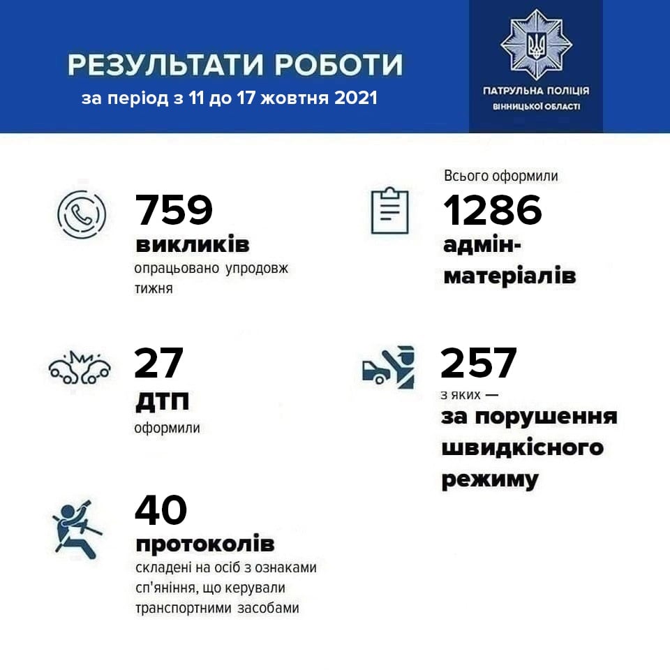 За минулий тиждень, більша частина якого були неробочі дні, у Вінниці склали 1286 адміністративних матеріалів, сталося 27 аварій на дорогах, протоколи за перевищення швидкості отримали 257 водіїв.