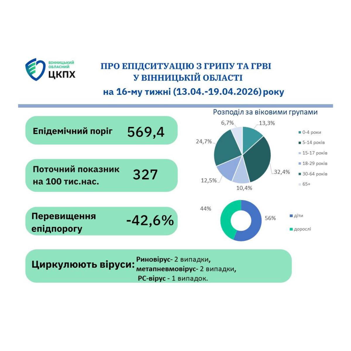 Упродовж 16-го тижня 2026 року (13–19 квітня) на Вінниччині захворіли 4744 особи. Це на 7,3% менше, ніж тижнем раніше, що свідчить про поступове зниження рівня захворюваності.