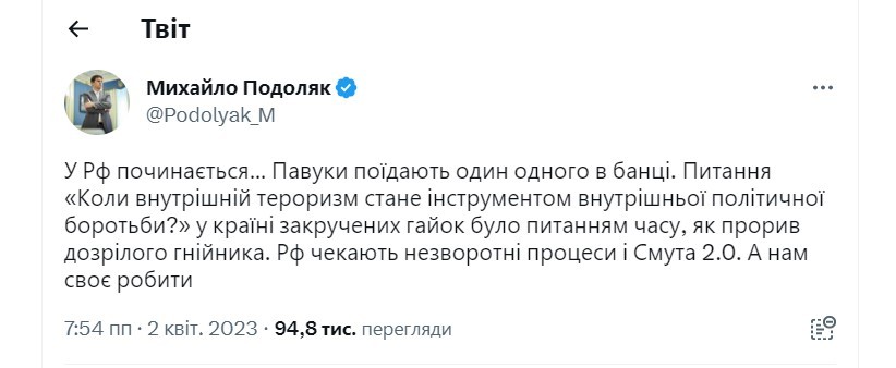 Окрім того, там зазначено, що на Росію очікують незворотні процеси та “Смута 2.0” (черговий смутний період). Своєю чергою Україна не має збиватися з власного шляху у той момент, коли в Росії відбувається подібне.