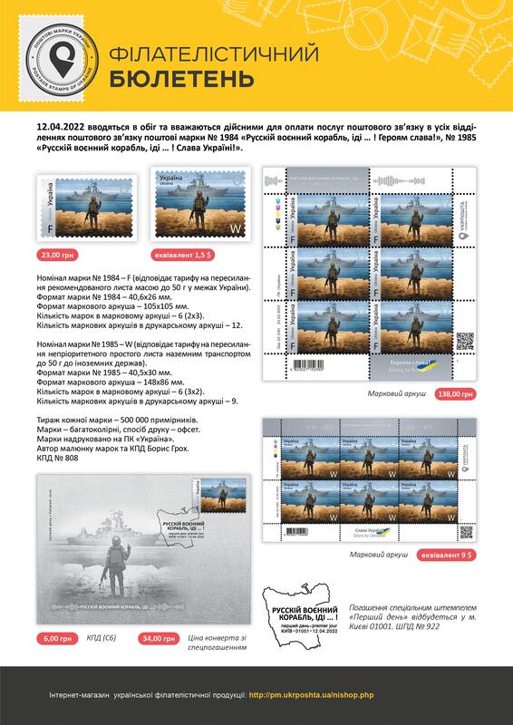 Президент України Володимир Зеленський сфотографувався із філателістичною новинкою, маркою що має назву «Русскій воєнний корабль, іді …!». Спеціальне погашення марки провели вчора, 12 квітня, у Вінниці.