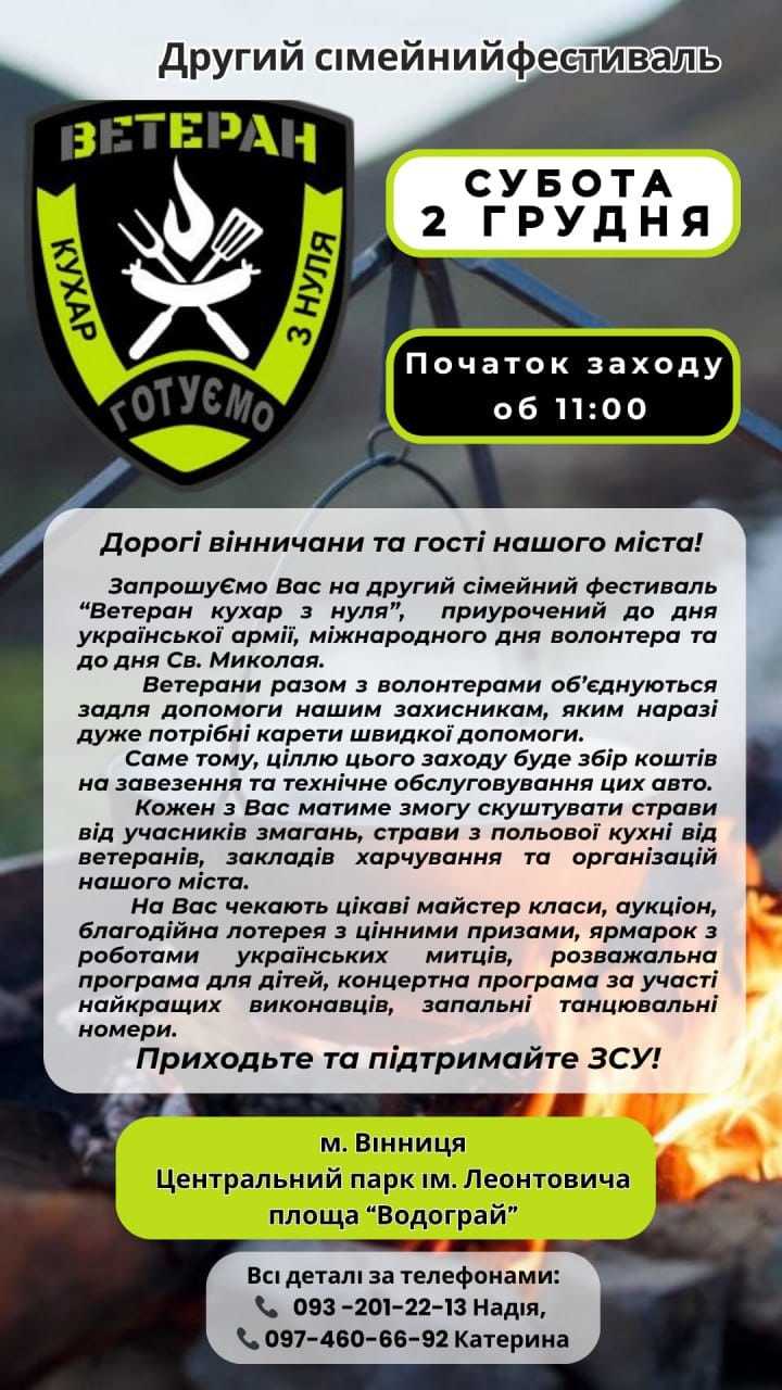 Другий родинний фестиваль “Ветеран-кухар з нуля” відбудеться у Центральному парку ім. Леонтовича у Вінниці. Захід пройде у цю суботу, другого грудня, на площі Водограй з 11:00 до 19:00.