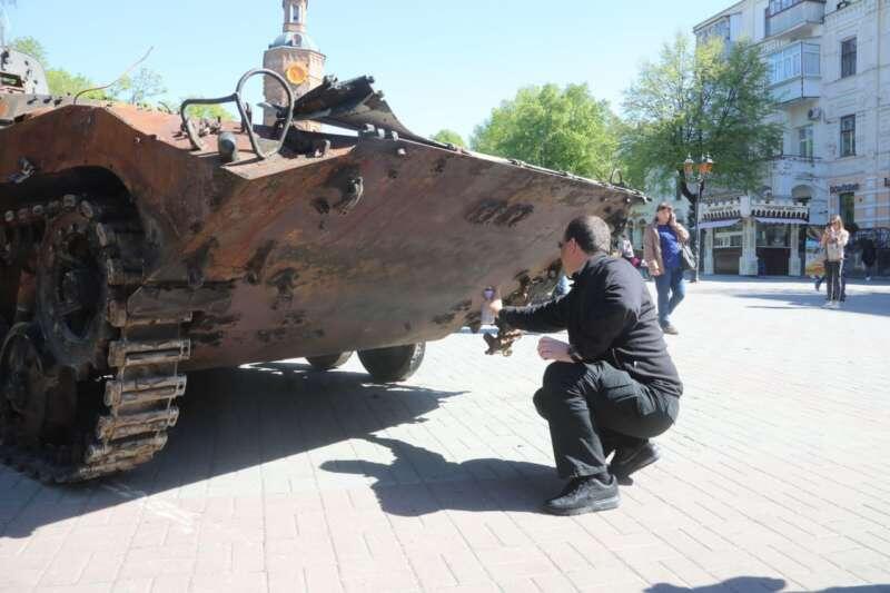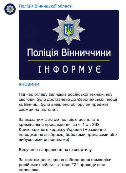 Під час огляду залишків російської техніки, яку 5 травня було доставлено до Європейської площі м. Вінниці, було виявлено обгорілий предмет схожий на пістолет. За вказаним фактом поліцією розпочато кримінальне провадження за ч. 1 ст. 263 Кримінального кодексу України (Незаконне поводження зі зброєю, бойовими припасами або вибуховими речовинами). Вилучене направлено на експертизу. За фактом розміщення забороненої символіки російських військ – літери “Z” проводиться перевірка, – зазначили у Нацполіції.